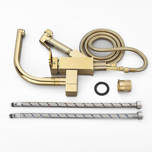 Mischbatterie mit Küchenbrause und goldenem Schwanenhals
